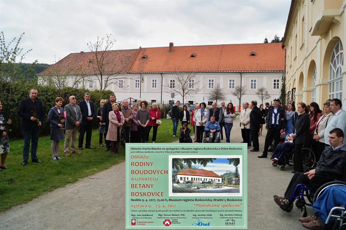 Pomáháme společně: Boudovi, Oblastní charita Blansko, Orel Boskovice, pod záštitou senátorky Ing. Jaromíry Vítkové.