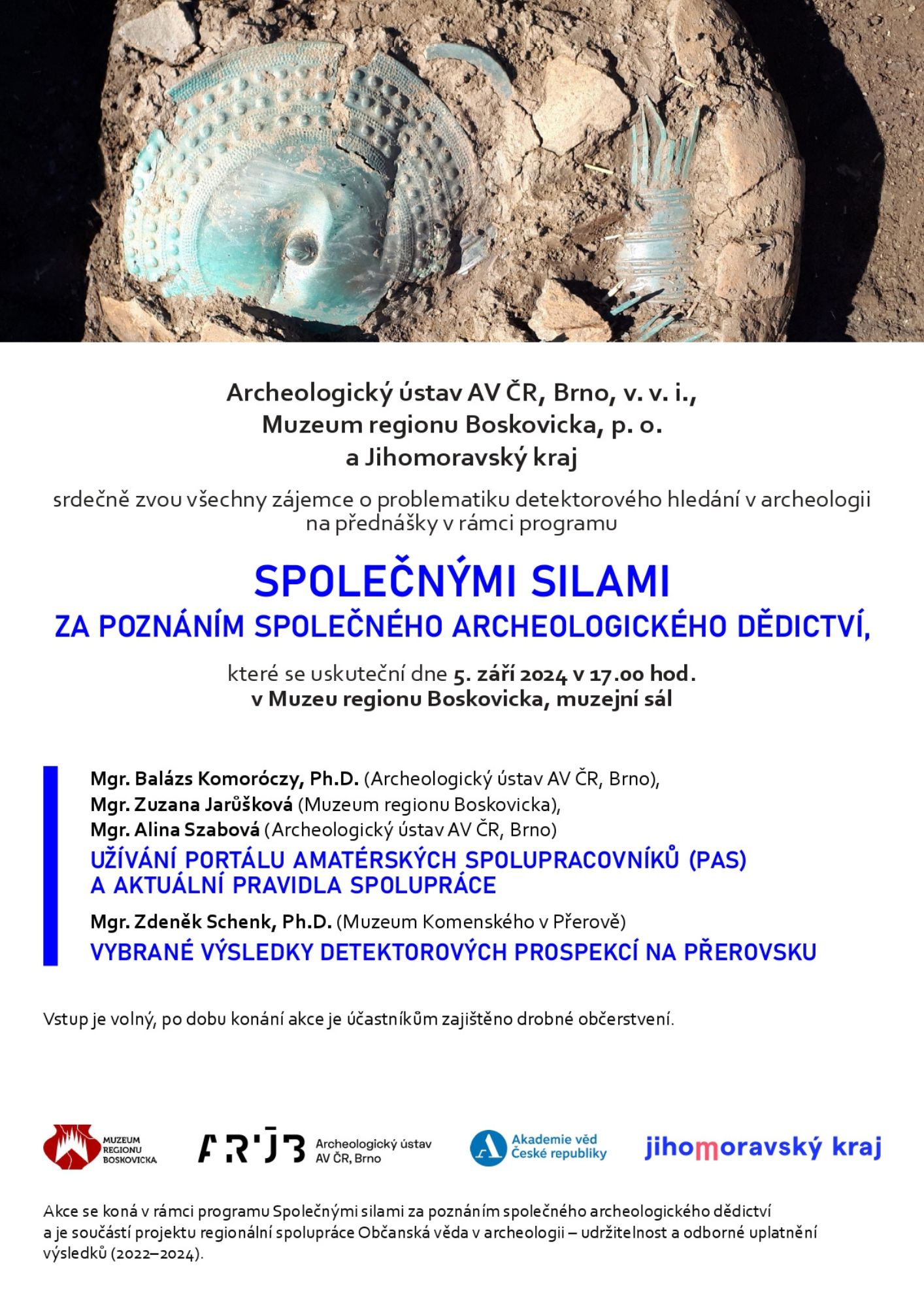 Ve čtvrtek 5. září od 17:00 se v Muzeu regionu Boskovicka uskuteční další setkání v rámci jihomoravského cyklu přednášek pod názvem Společnými silami za poznáním společného archeologického dědictví Jihomoravského kraje, zaměřeného na spolupráci s hledači s detektory kovů.