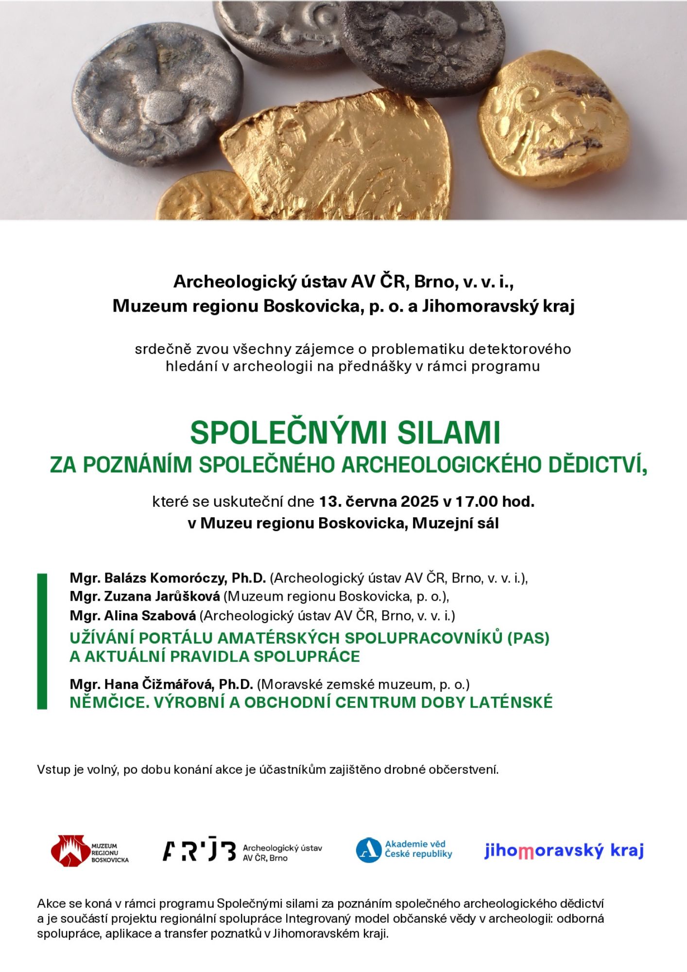 Archeologický ústav AV ČR, Brno, v. v. i., Muzeum regionu Boskovicka, p. o. a Jihomoravský kraj srdečně zvou všechny zájemce o problematiku detektorového hledání v archeologii na přednášky v rámci programu Společnými silami za poznáním společného archeologického dědictví.
